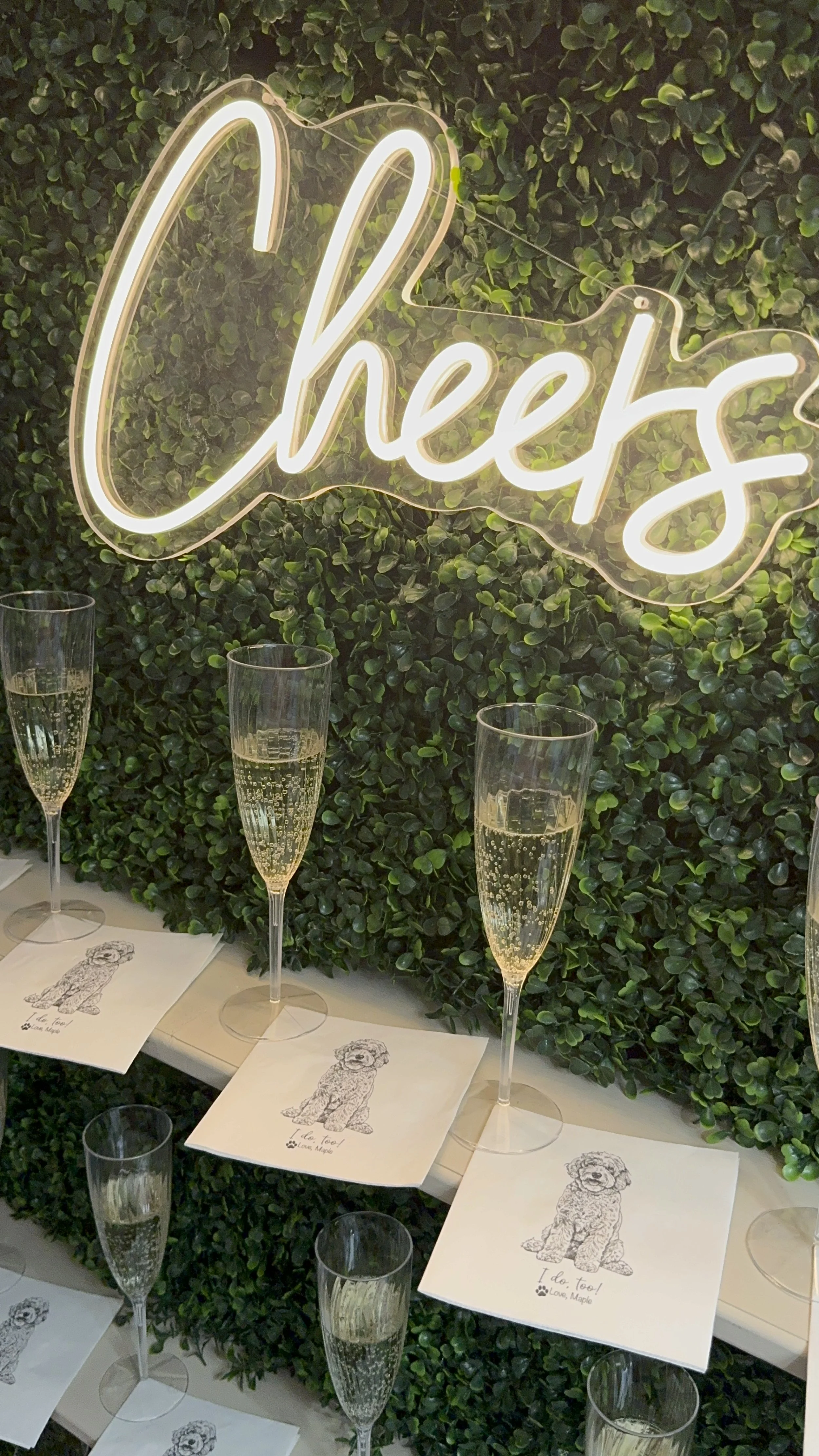 Although typically used as a champagne wall, this particular model can also be used as a seating chart/champagne wall hybrid, or even a dessert display! The options are endless as the Cheers neon sign is removable.