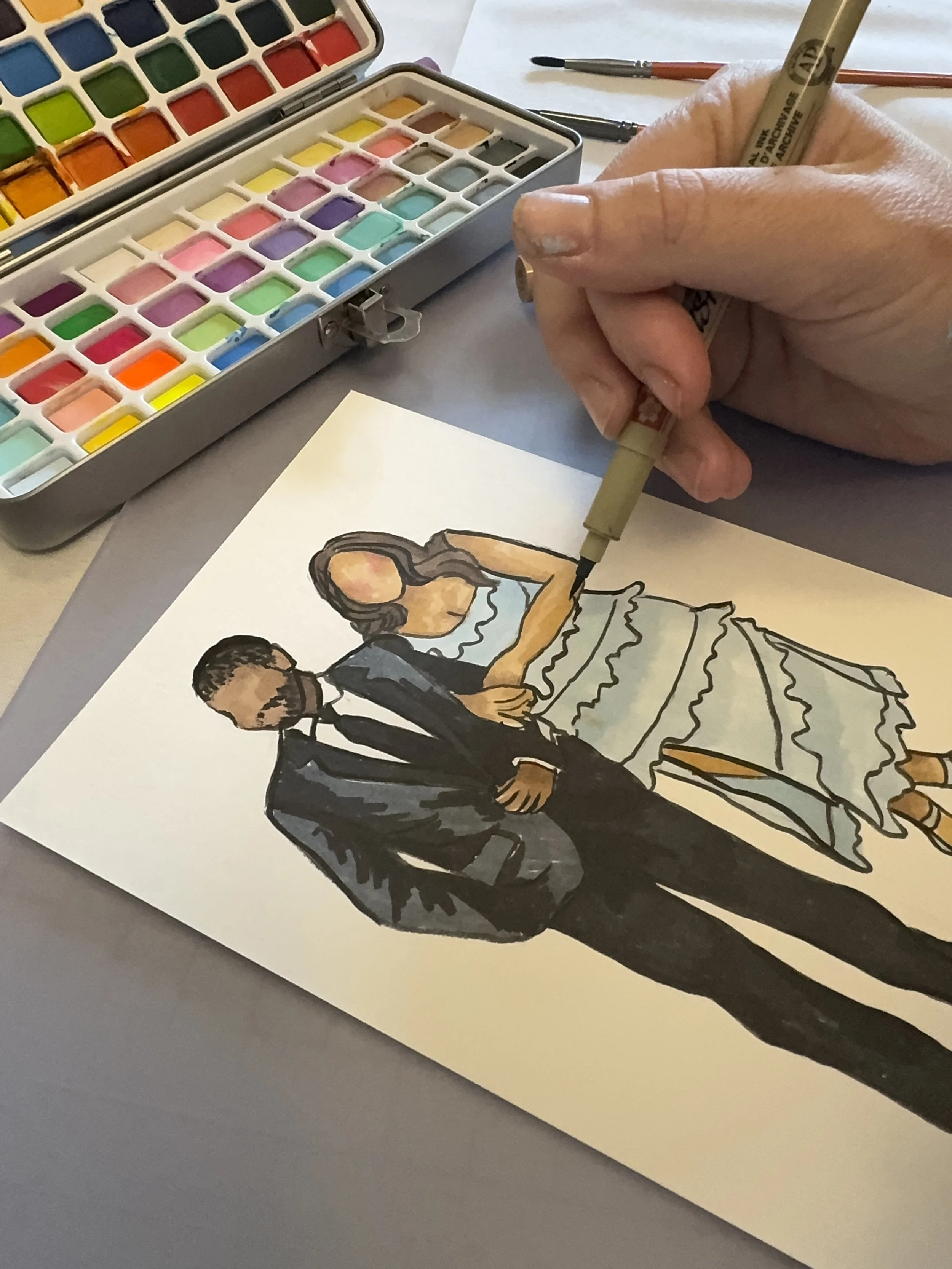 The number of people we can sketch at an event may vary. That said, we work at a steady pace throughout the entire night to ensure we deliver an appropriate number of drawings in the time allotted. We don’t take breaks and work as a team to ensure the quality is meeting our very high standards and that we are creating an amazing experience for you and your guests. Any unfinished portraits will be completed and mailed to you within two weeks of your event at our home studio. From there, you can either personally distribute them or include them with thank you cards at a later date!