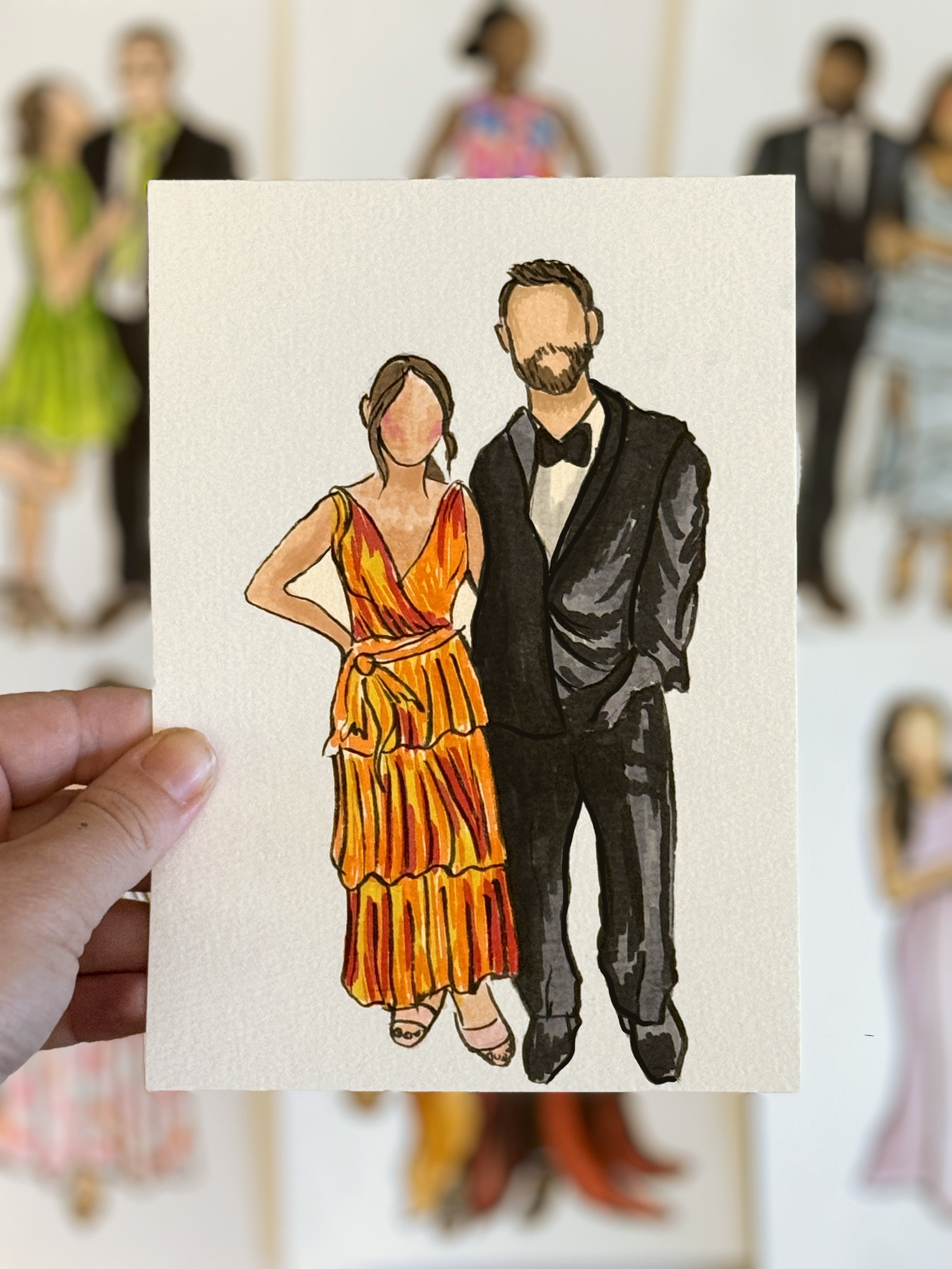 Claire and Josh will arrive at least 1 hour prior to all bookings to get completely set up and ready to illustrate once guests arrive. We will photograph any interested attendees who want their portrait drawn so that they don’t have to stay at our table and miss out on any festivities. Together, we will work on portraits throughout the night, and any that do not get completed within the booked session will be finished at our home studio and delivered to you within two weeks of the event :)