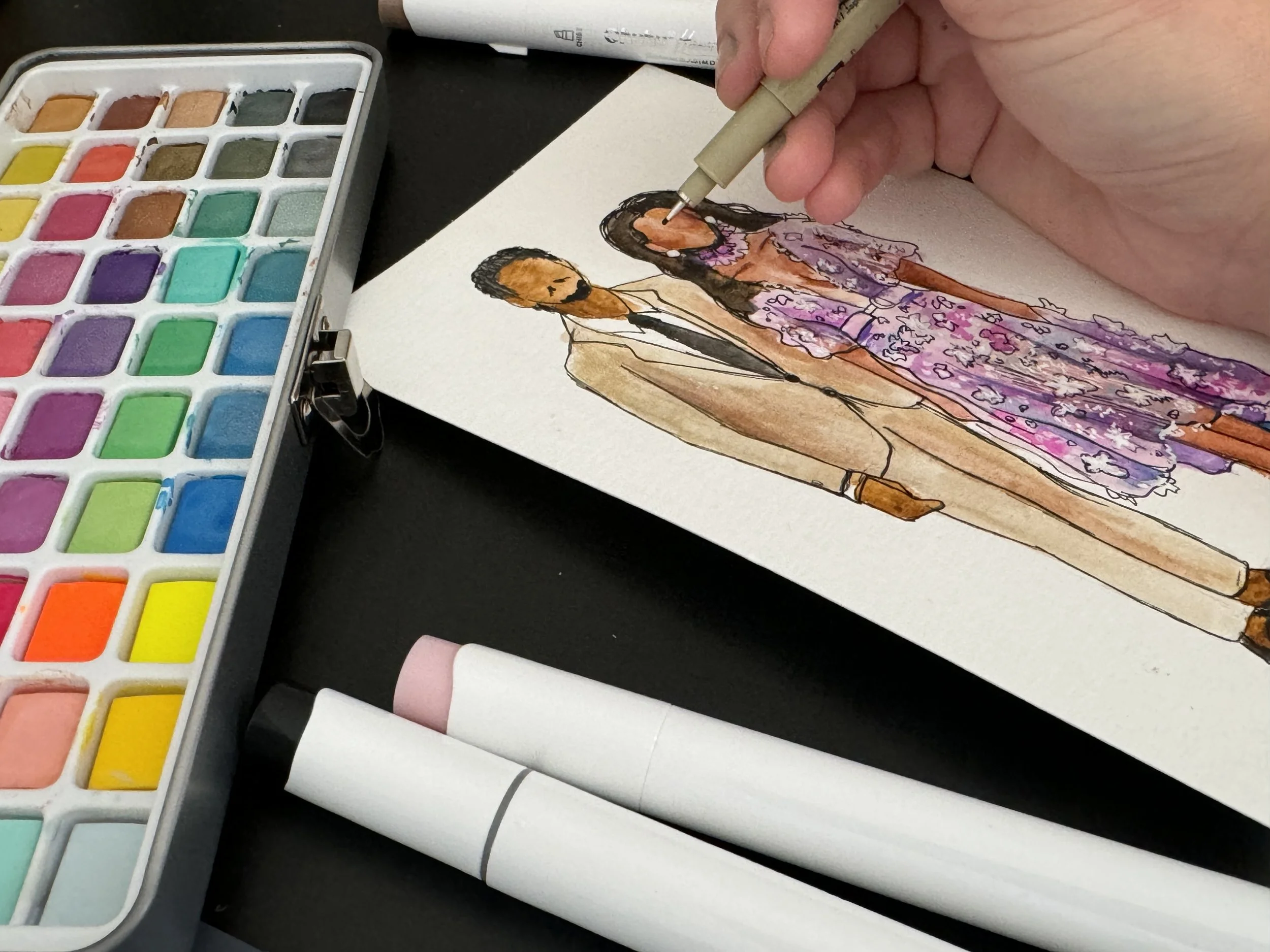 This package will include up to five hours of on-site drawing/painting as well as completing any additional portraits at home that do not get finished in person for up to 80 guests. Includes a complimentary 8”x10” more detailed portrait of couple.